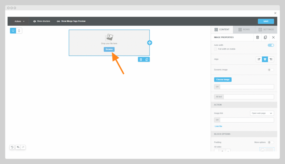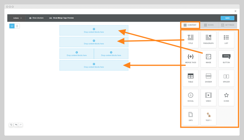 - Simply drag the desired content block (e.g. Text, Image, Button) into one of your previously defined rows in the editor.
