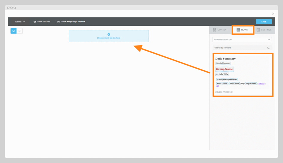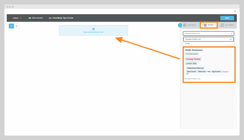 This ready-made block is designed specifically for displaying your media monitoring results (e.g. article title, source, date) in a repeatable format. You can drag and drop this directly into the editor to define where the dynamic article list should appear. (Screenshot: Preconfigured article row) - Start from an empty layout: