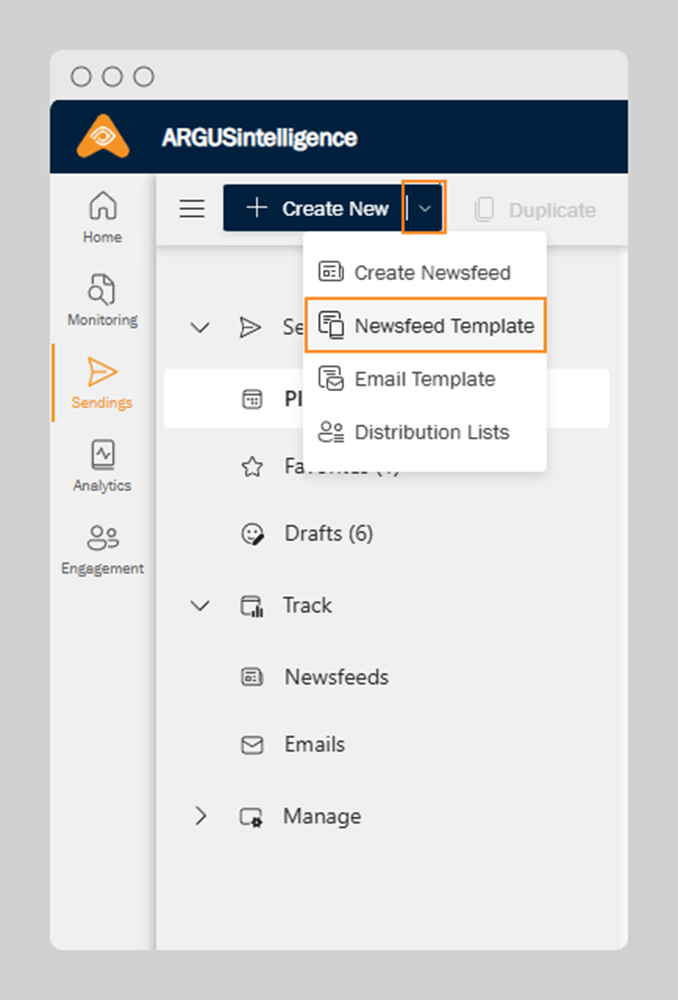 To get started, click “+ Create New” in the top action bar and select Newsfeed Template
