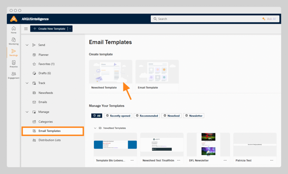 Alternatively, you can also navigate to Email Templates via the left-hand navigation: open the Manage area in the Sendings section and click Email Templates. This area contains all of your saved templates — and enables you to create a new template by selecting Newsfeed Template (screenshot: Starting a new template from the Email Templates overview).