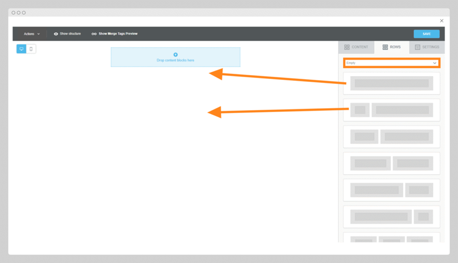 In the Rows tab on the right-hand side of the BeeFree editor, you will find structural building blocks for your layout.