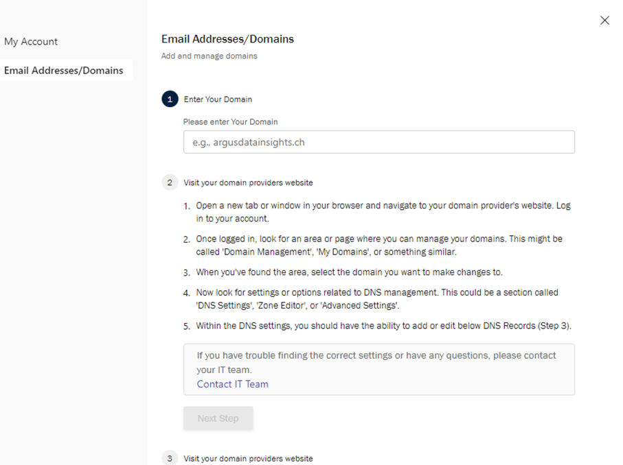 Domaines : cliquez sur « + Ajouter un domaine » pour ajouter rapidement et facilement un domaine. Saisissez ensuite le nom du nouveau domaine et suivez les instructions de l’étape 2 :
