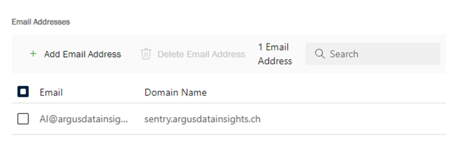 Adresse e-mail : en dessous des domaines, vous pouvez également ajouter des adresses e-mail à votre compte. Par exemple, si vous souhaitez envoyer quelque chose dans le module Sendings, vous pouvez ajouter une adresses e-mail en cliquant sur le bouton « + Ajouter une adresse e-mail ».