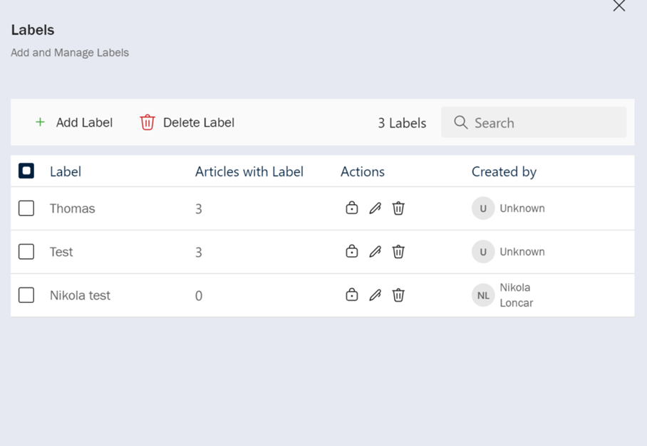 - Éditer/supprimer/verrouiller des étiquettes : dans la rubrique de gestion des étiquettes, vous pouvez utiliser les icônes de la colonne Actions pour éditer, verrouiller ou supprimer des étiquettes une par une. Vous pouvez également supprimer plusieurs étiquettes en une seule fois en cochant les cases correspondantes à gauche, puis en cliquant sur Supprimer l’étiquette.