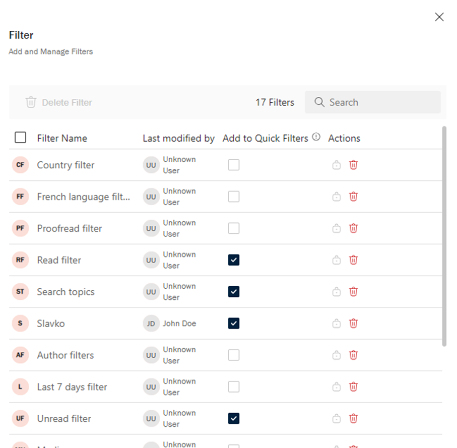 - Verrouiller/déverrouiller : utilisez l’icône du cadenas pour empêcher toute modification ou suppression accidentelle par d’autres utilisateurs*trices. Seule la personne à l’origine de la création du filtre peut modifier ou supprimer un filtre verrouillé.
