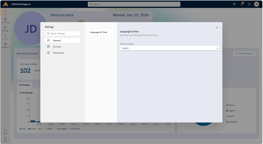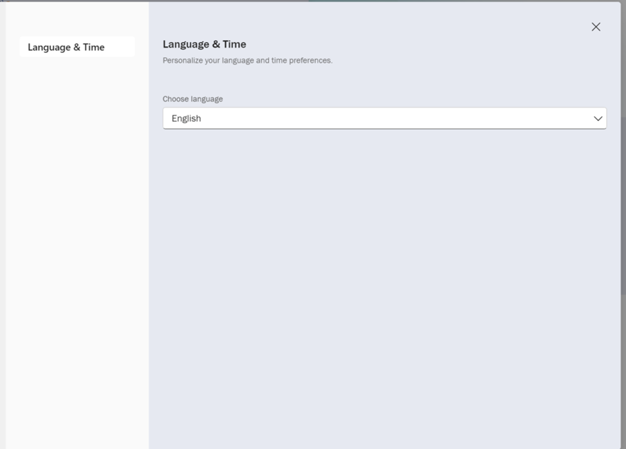 - Langue et heure : vous pouvez y régler la langue et le fuseau horaire de la plateforme. Sélectionnez votre langue préférée à partir du menu déroulant (dans la capture d’écran, l’anglais est sélectionné).
