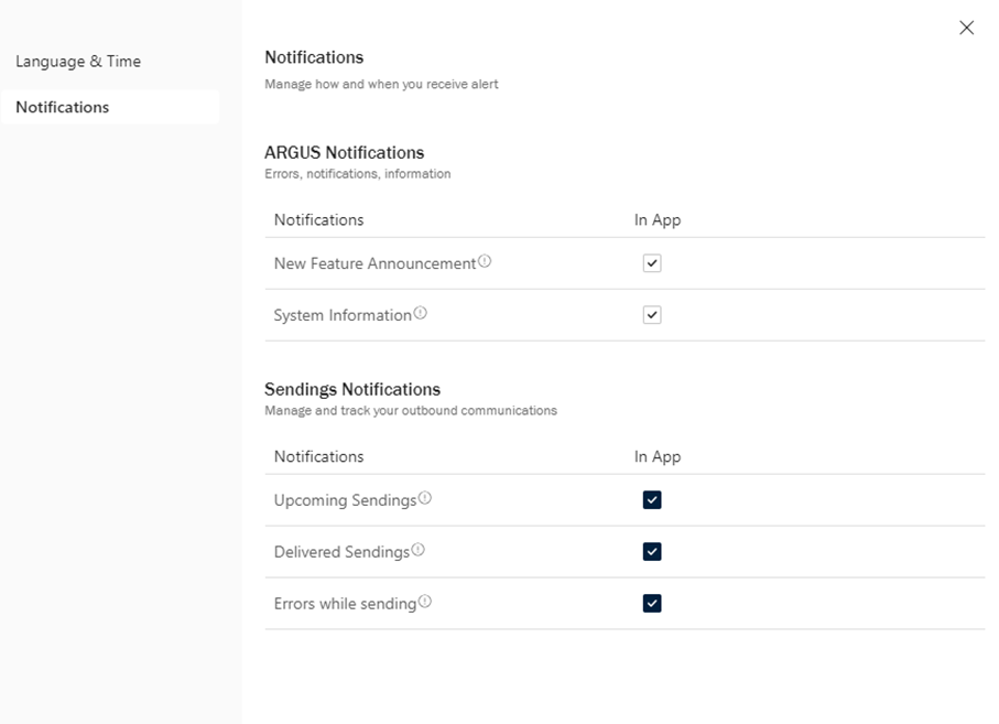 - Notifications : ce paramètre peut être utilisé pour définir comment et quand recevoir une alerte pour différentes notifications. Il comprend une section Notifications ARGUS et une section Notifications Sendings. Cochez les différentes cases pour recevoir des alertes correspondantes. D’autres types de notifications seront bientôt disponibles. Vous trouverez sur la capture d’écran ci-dessous toutes les options proposées.