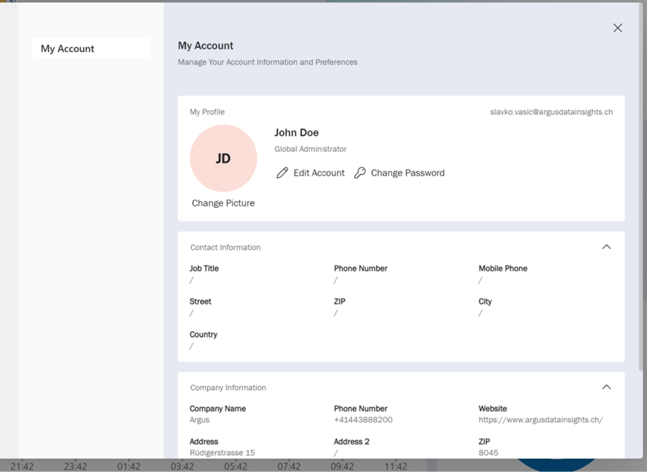 - Admin : vous pouvez également gérer les autres utilisateurs*trices (fonctionnalité bientôt disponible) et modifier les informations du compte (p. ex. informations entreprise).