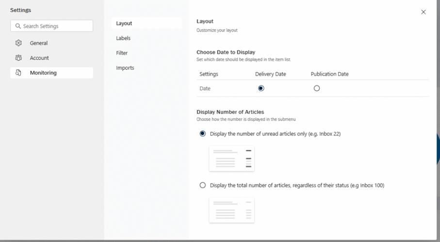 Les paramètres de mise en page vous permettent de personnaliser l’affichage des listes d’items et des indicateurs de comptage dans le module Monitoring afin de l’adapter à votre flux de travail préféré. Ces configurations vous aident à obtenir une meilleure vue d’ensemble de vos articles et à détecter plus rapidement les informations pertinentes.